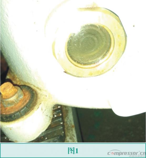 冷干机的压缩机突然发出异响,先用钳形电流表勾取压缩机的运行电流,显示运行电流为31A,和另外5台冷干机的运行电流接近,说明压缩机内部无明显的磨损。打开冷干机的盖板,检查压缩机外观也无明显的振动,确认为内部异响。看压缩机的油位镜时,发现冷冻油为黄色略带点黑色,如图1所示。