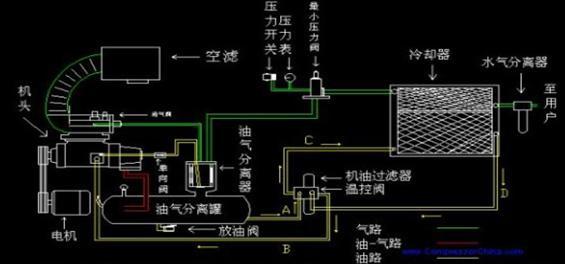 空压机油的循环过程可以理解为两路,即机头至油气分离罐至油气分离器至单向阀至机头;而另一油路又可分为两个过程,即机头至油气分离罐至温控阀至机油过滤器至机头,当温度超过温控阀感温元件动作值时(一般为71℃时动作)油路循环过程为:机头至油气分离罐至温控阀至油冷却器至温控阀(汇合)至机油过滤器至机头。如果以上全都理解,接下来我们就可以进入主题来分析空压机温控阀的连接管(A、B、C、D管)的温差来判断空压机高温的根源: