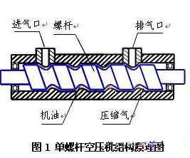 以单螺杆压缩机为例说明空气压缩机工作原理,如图1所示为单螺杆压缩机的结构原理图。螺杆压缩机的工作过程分为吸气、密封及输送、压缩、排气四个过程。当螺杆在壳体内转动时,螺杆与壳体的齿沟相互啮合,空气由进气口吸入,同时也吸入机油,由于齿沟啮合面转动将吸入的油气密封并向排气口输送;在输送过程中齿沟啮合间隙逐渐变小,油气受到压缩;当齿沟啮合面旋转至壳体排气口时,较高压力的油气混合气体排出机体。